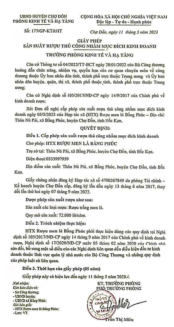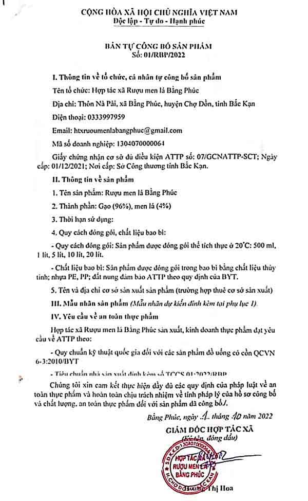 Giấy phép sản phẩm Rượu Men Lá Bằng Phúc
