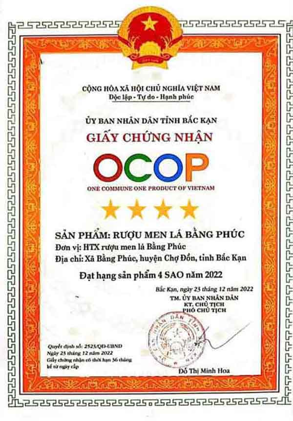 – Chứng nhận OCOP 4 Sao của rượu men lá Bằng Phúc đòi hỏi sản phẩm đạt các yêu cầu khắt khe theo chương trình OCOP là đặc sản rượu truyền thống tiêu biểu tại khu vực Bắc Kạn.