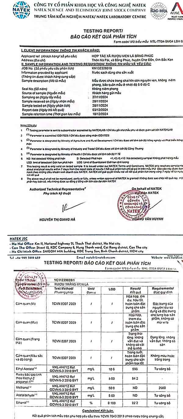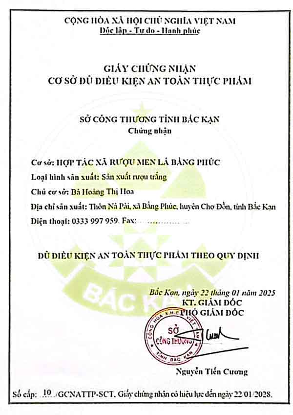 Rượu men lá Hợp Tác Xã Bằng Phúc có đầy đủ giấy phép bao gồm: giấy cơ sở đủ điều kiện vệ sinh an toàn thực phẩm, giấy kiểm định chỉ số an toàn và giấy chứng nhận sản phẩm đạt OCOP 4 Sao.